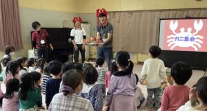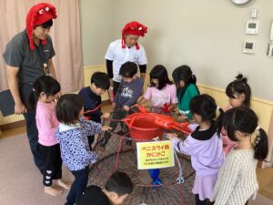 毎年恒例‼みんなが楽しみにしているカニ集会を行い、こぐま・めだか・うさぎ組が参加しました。境港市役所子育て支援課の方にもお越しいただき、境港で水揚げされるベニズワイガニについて”かにしばい”で教えてもらったり、「どうして釣り竿では釣れないの⁈」という質問にも、「深い海に住んでいて、釣り竿が届かないからだよ」など分かりやすく説明してもらいました。本物のカニが出てくると、思わず立ち上がってしまうほど興味津々のお友達もいましたよ。年長さんはお楽しみの試食タイムもあり、おいしいカニを食べるために、自分で硬い殻を一生懸命剥いていました。やっと口に入ると、「おいしい‼」の言葉があちこちから聞こえ、いい表情で食べていましたよ。境港でとれる海産物を知り、見たり食べる経験を通して、境港に親しみを持ってほしいです。