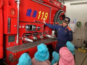 今年も、年中さんのお楽しみ!バスに乗って境港消防署へ見学に行ってきました。ハシゴ消防車やポンプ車など、色々な消防車や救急車の中にあるものを見ながら詳しく説明を聞きました。ドクターヘリもやってきて、間近で見る迫力に驚いていました。消防士さんとたくさん話すうちに憧れる気持ちがどんどんふくらみ、「はやくおとなになりたい!」という感想を伝えてくれたお友達もいましたよ☆生活に関係の深い施設を知り、またひとつ興味が広がった年中さんでした。