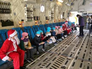C-2輸送機からパラシュート投下の様子を見た後、着陸したその輸送機から…サンタクロースさん、トナカイさんがプレゼントを届けにやってきてくれました。子ども達はびっくり&大喜び♡みんなニコニコになりましたよ♬